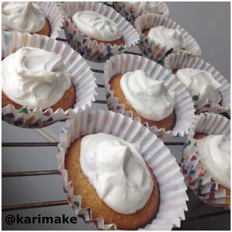 Mix philadelphia, low fat greek yoghurt, liquid sweetnerand vanilla powder together and spread over the cooled baked muffins.