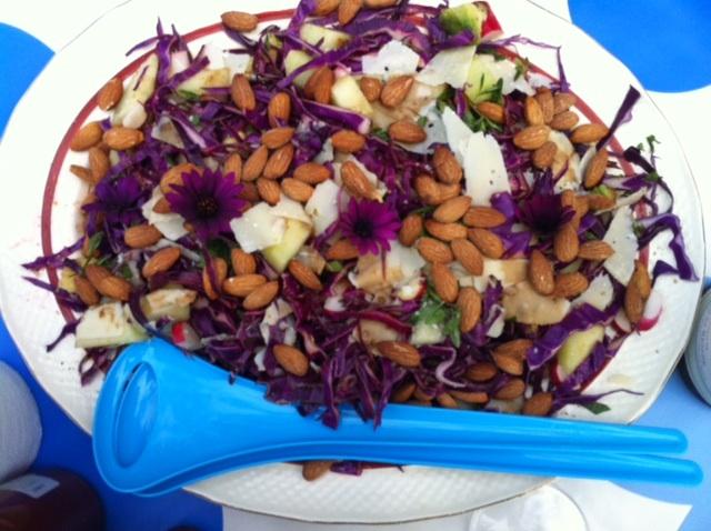 Sæt de friske blomster i mindten af salaten lige før servering.
