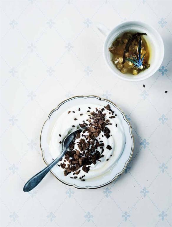 Kom skyren i en skål. Top med vaniljepulver, og hæld hasselnøddeolie over. Drys med hørfrøknas.